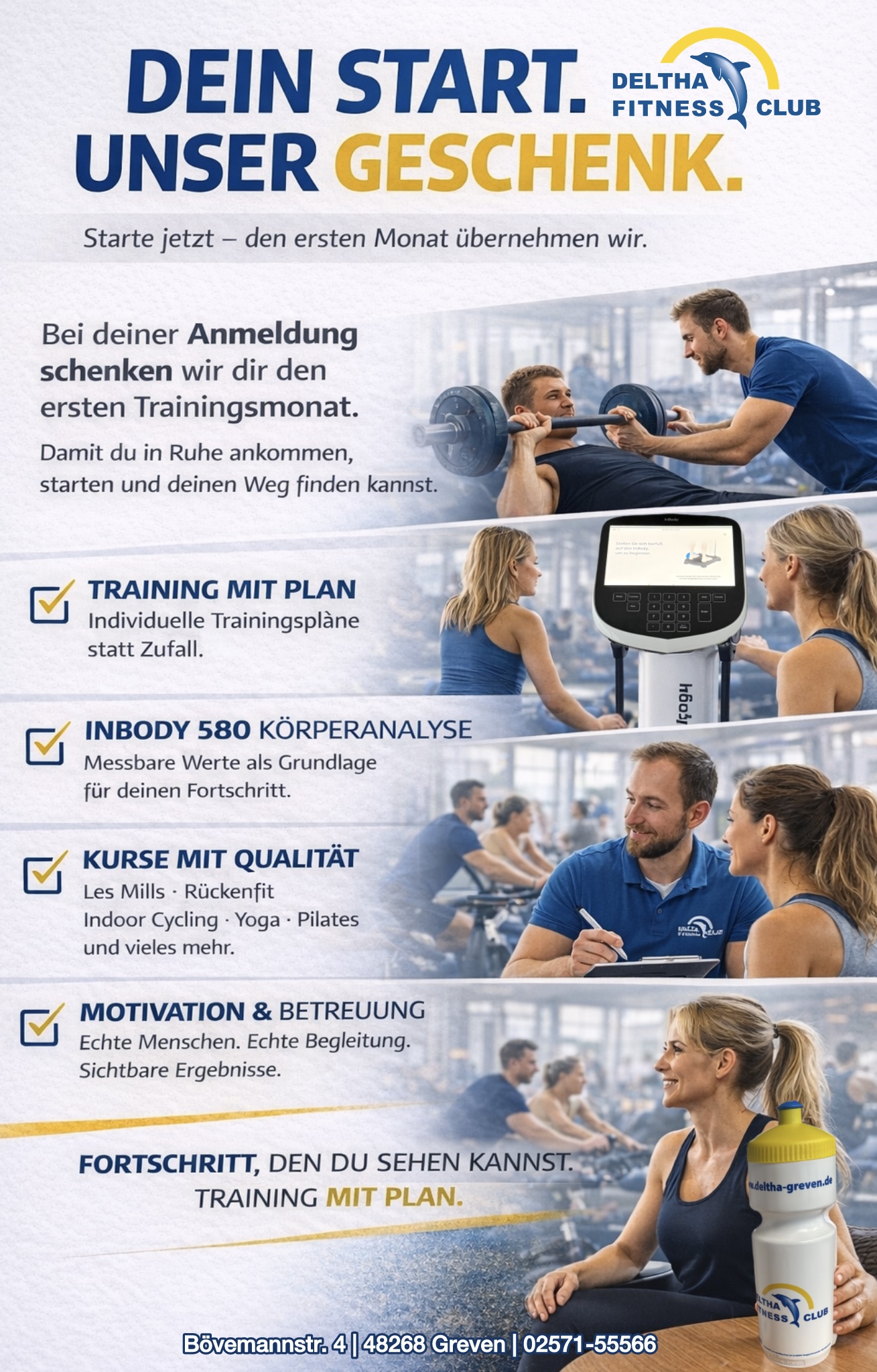 Bei deiner Anmeldung schenken wir dir den ersten Trainingsmonat. Wir kümmern uns um den Plan, zeigen dir Schritt für Schritt, was für dich sinnvoll ist, und begleiten dich vom ersten Training an.